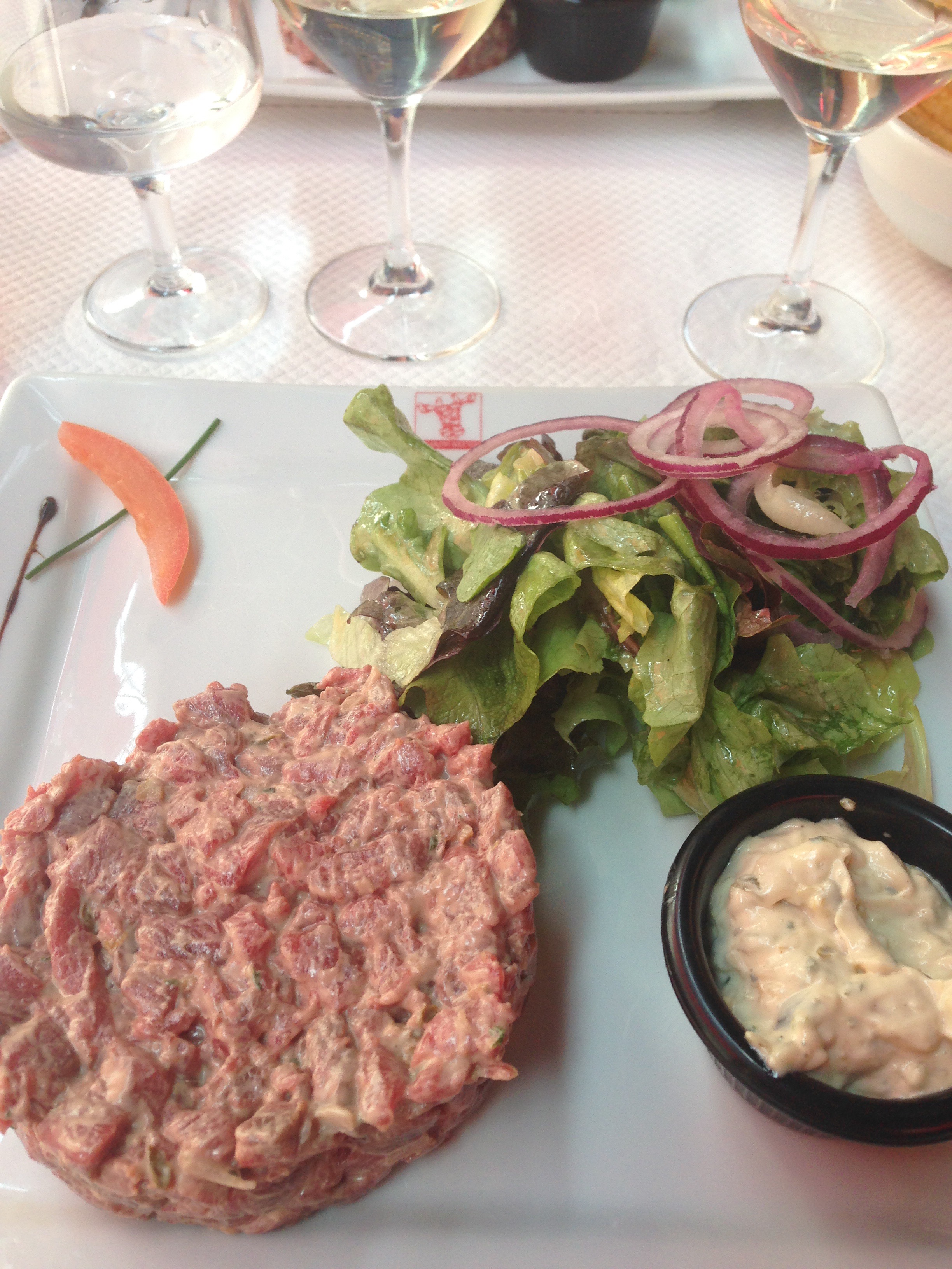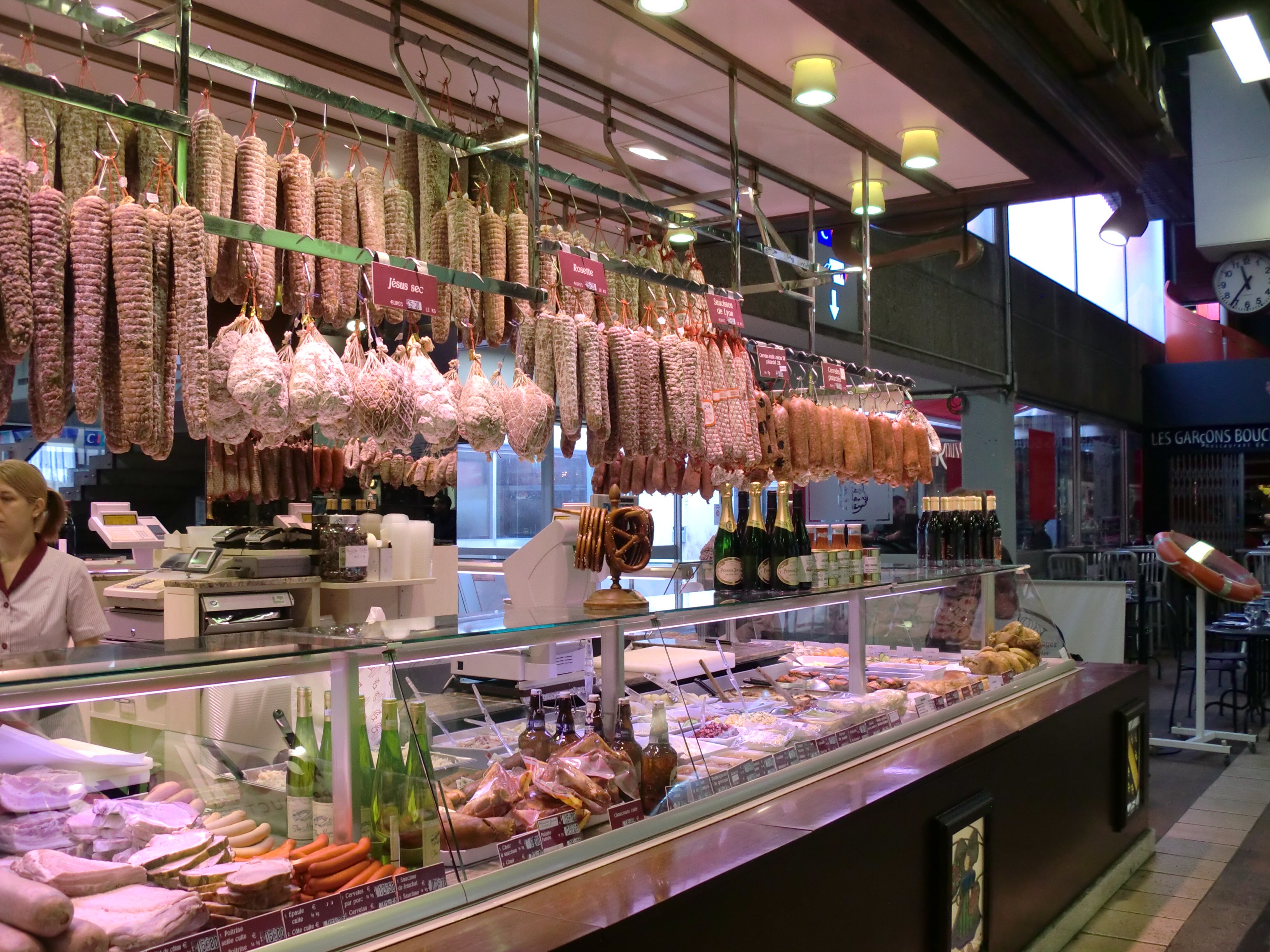 Anyhow, you’d expect the food market that bares his name to be pretty special right? That it is. We lost hours in here and it’s a photographers delight! What I hadn’t understood is that there are many little restaurants above fishmongers and butchers and cheese shops, serving everything from huge crushed ice platters of seafood to a truffle tasting and wine peaking for €89 if that is what you desire. Not your normal market!! We went for steak tartare, frites and a bottle of icy cold crisp house white above a butchers called Les Garçons Bouchers and it was outstanding!