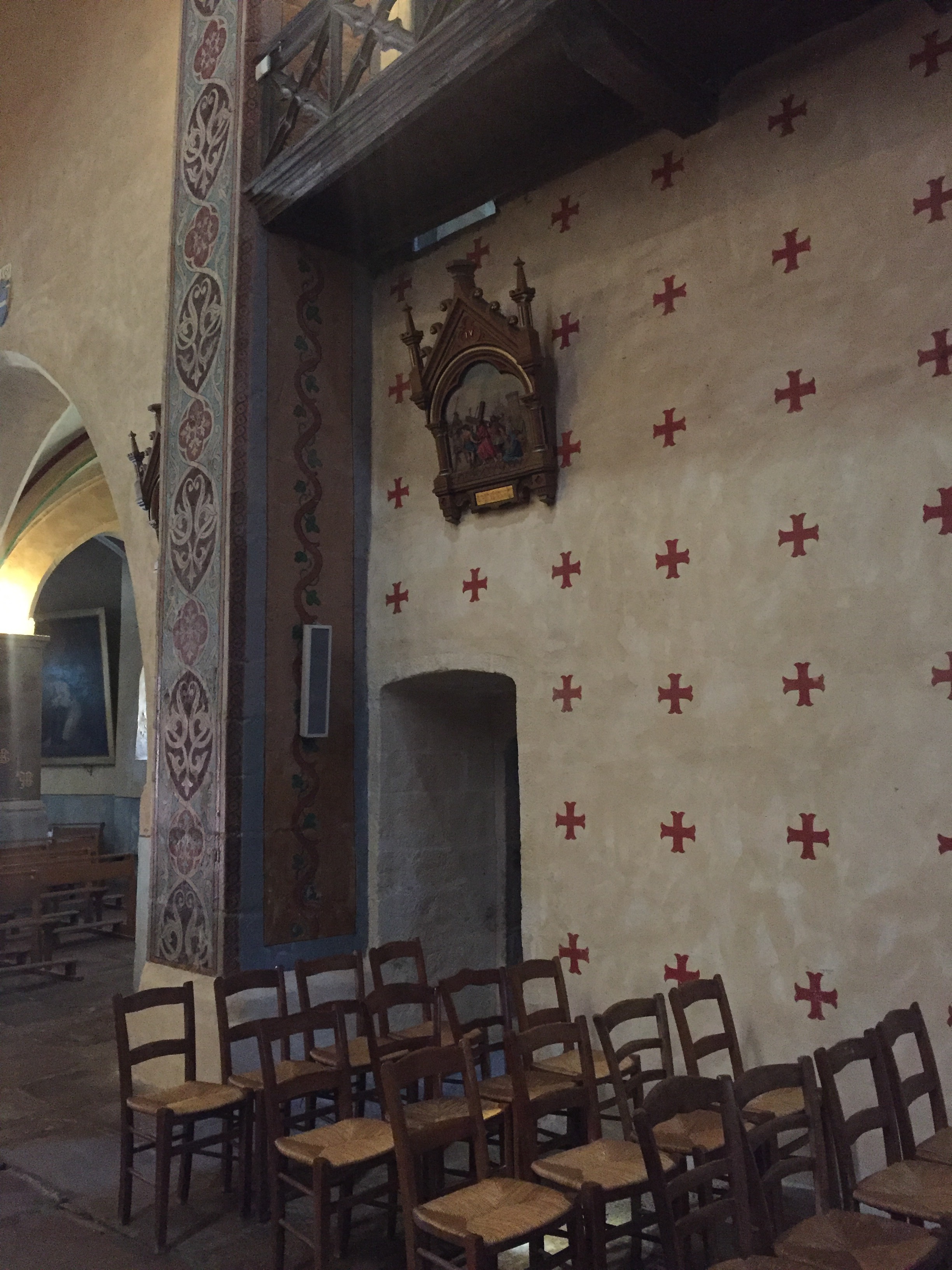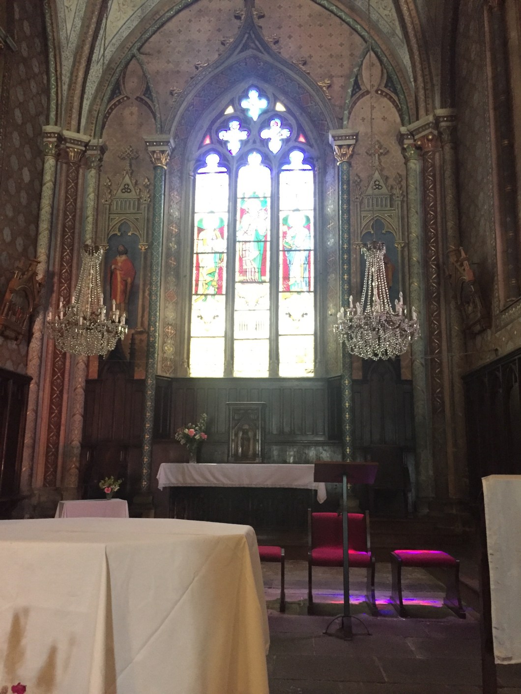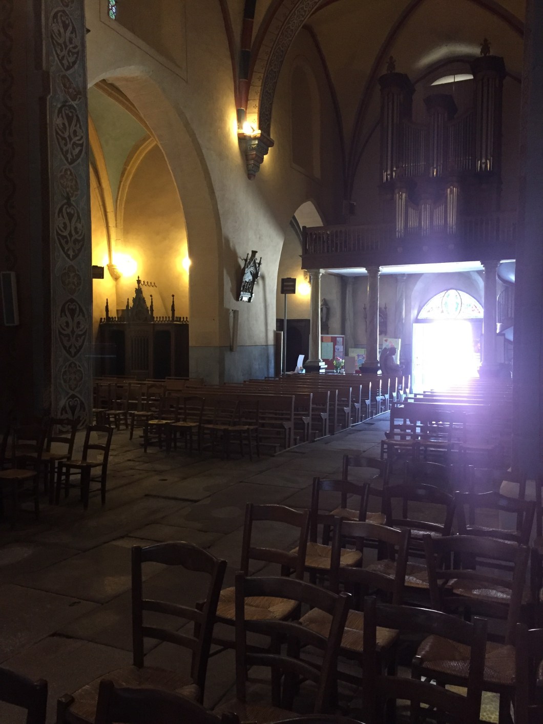 I write this outside the Eglise St Jean in the market square in Bourganeuf. It’s the sleepy lunchtime lull so the square is deserted the only sounds are the chiming of the church bells and the babbling of the fountain. The others have gone to do some last minute shopping while I’ve had the church to myself enjoying the light and the faint mustiness of incense.
