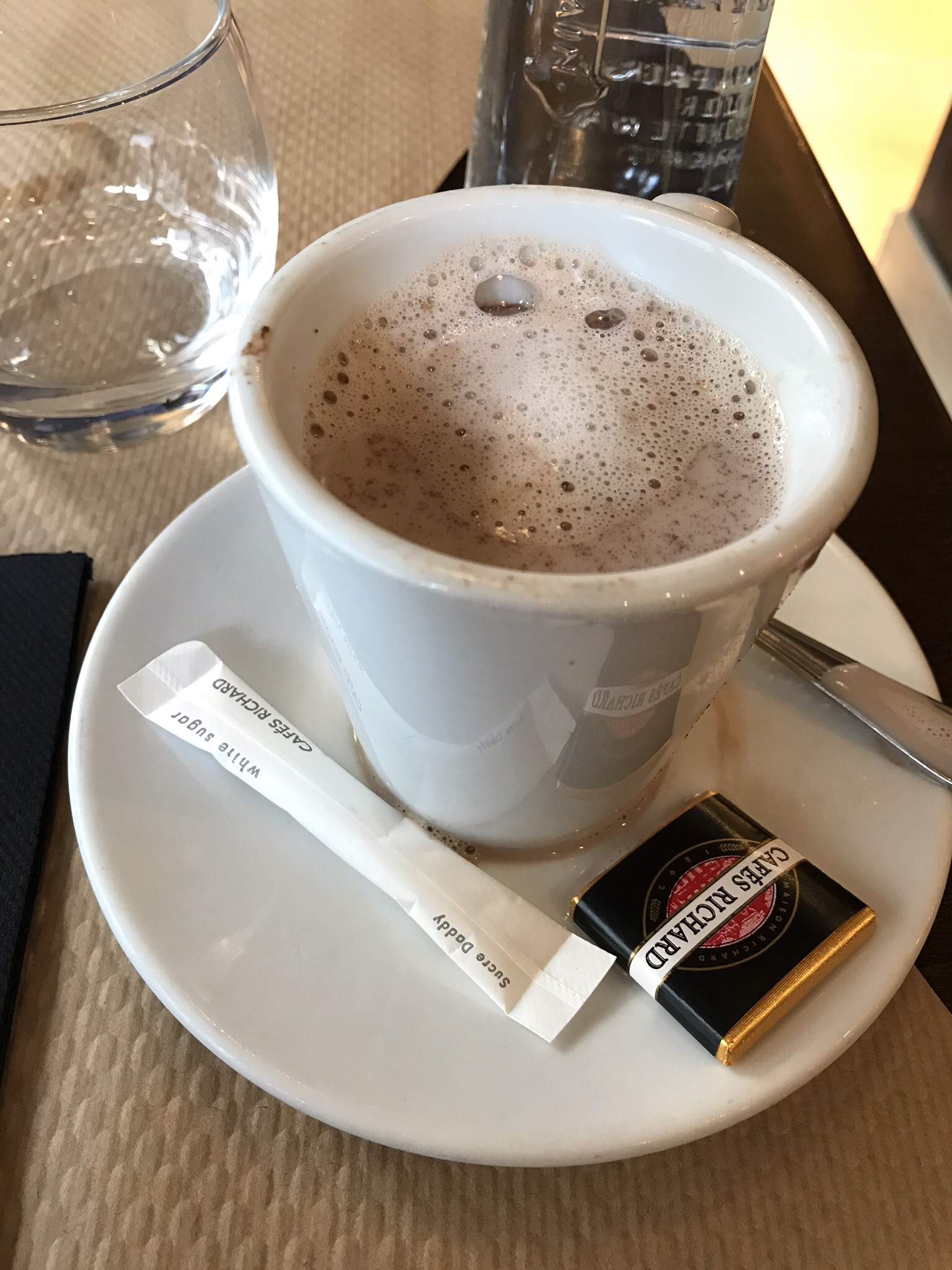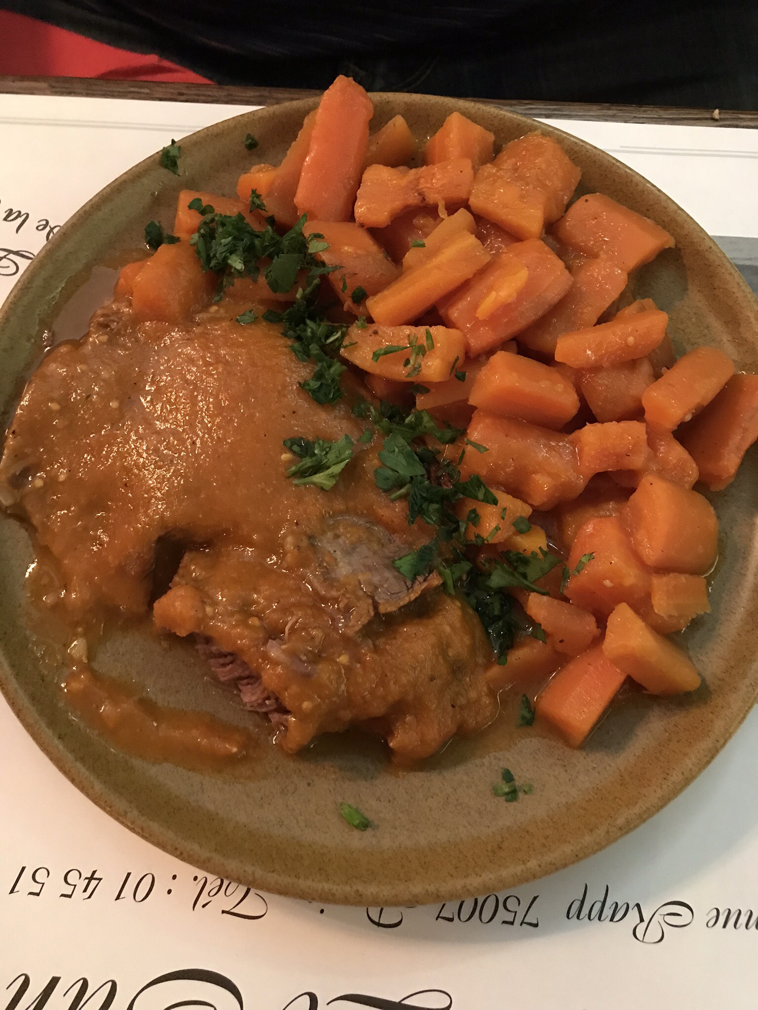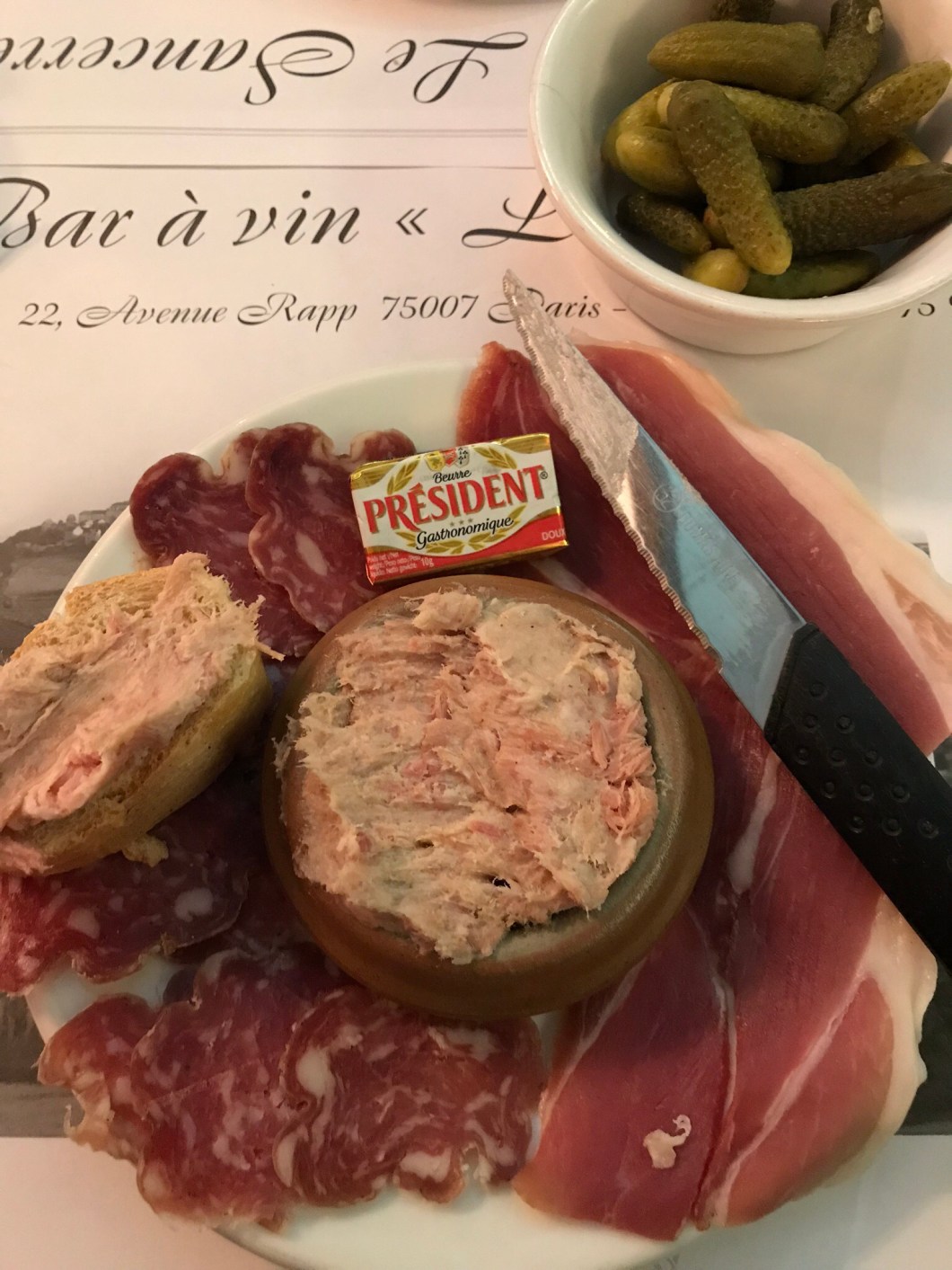 There was a limited choice of plat du jour, the quiche was hastily wiped off the blackboard with a wet finger, and the beef with fondant carrots there was just one portion left. Craig opted for the beef, amusingly, we heard the microwave fire up (it was behind the bar) and sure enough – ping, out came Craig’s beef. It was literally half a plate of beef, half a plate of school dinnery looking carrots, but was very tasty. I went for the charcuterie board of various different types of pork, rilletes, dried cured sausage and some thick cut jambon. Served with cornichons, mustard and bread. Very acceptable.