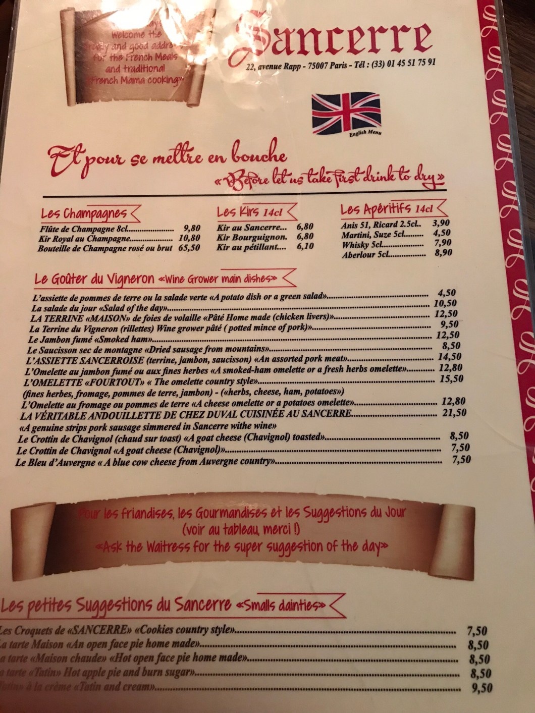 The restaurant Sancerre was very traditional, think stuffed boars heads on the walls, clocks that needed winding, dark wood furniture and was seemingly run by Gepetto and his wife. Both of which were engrossed in the French version of 4 rooms on the tv which we were doing our best to follow.