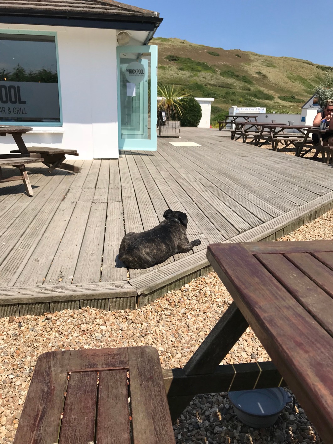 Recent austerity measures have meant that just eating out together with the dogs in the sun felt like such a wonderful treat, and it’s the relaxing break the birthday boy deserved and needed. Of course he’s now a disgusting colour, and I’m the requisite colour of spam. Ah well.