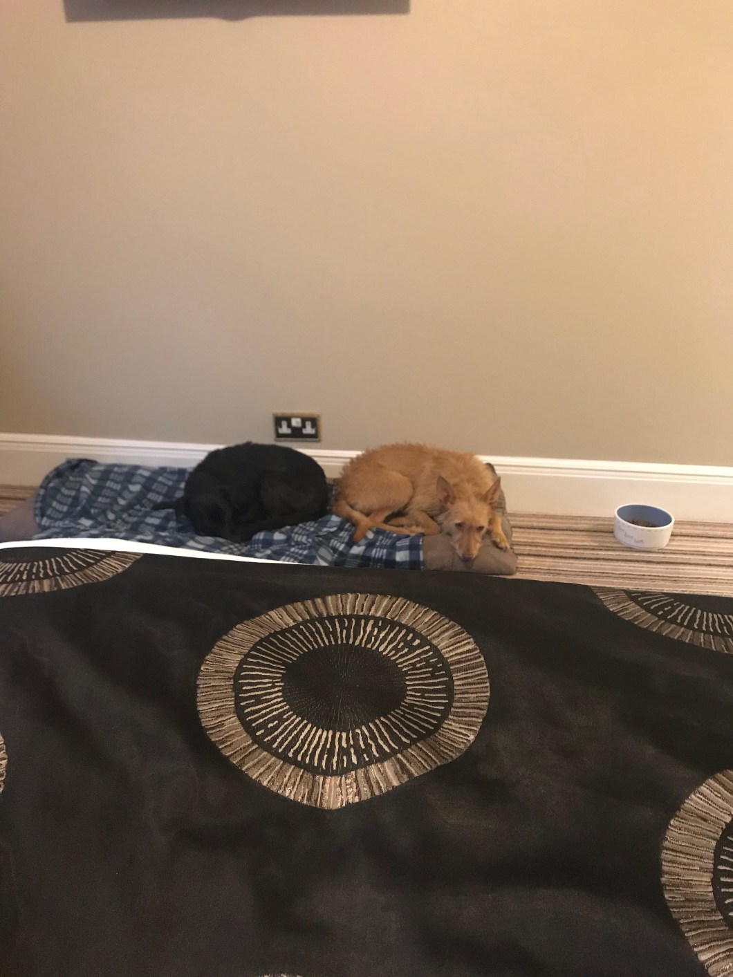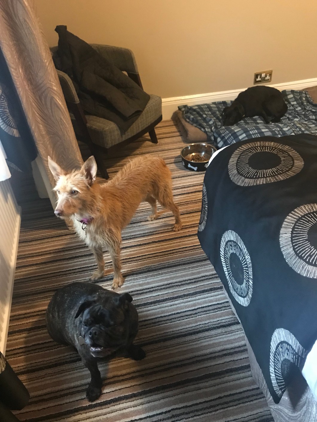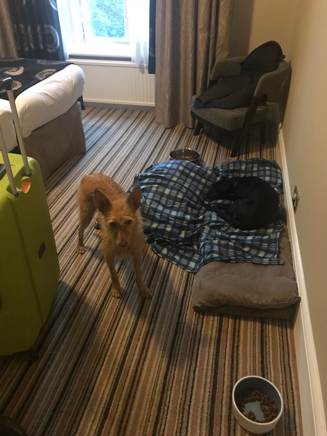 I have a beer and am currently relaxing in the Best Western Burlington at Folkestone, which I have got to say has been a welcome surprise in a very stressful few days. I honestly think we stayed in a worse hotel for part of our honeymoon. I had low expectations given it’s a dog friendly room. I really struggled to find a hotel that would allow 3 dogs firstly, this they did by prior arrangement and were so helpful. Secondly, the room is lovely, and already laid out with dog beds and bowls. Just brilliant after today. All three have had so much upheaval in the last few weeks, their routine has been totally changed, yet they slept the full 4.1/2 hours to here, and are now after much excitement at going in the lift, are all sleeping.