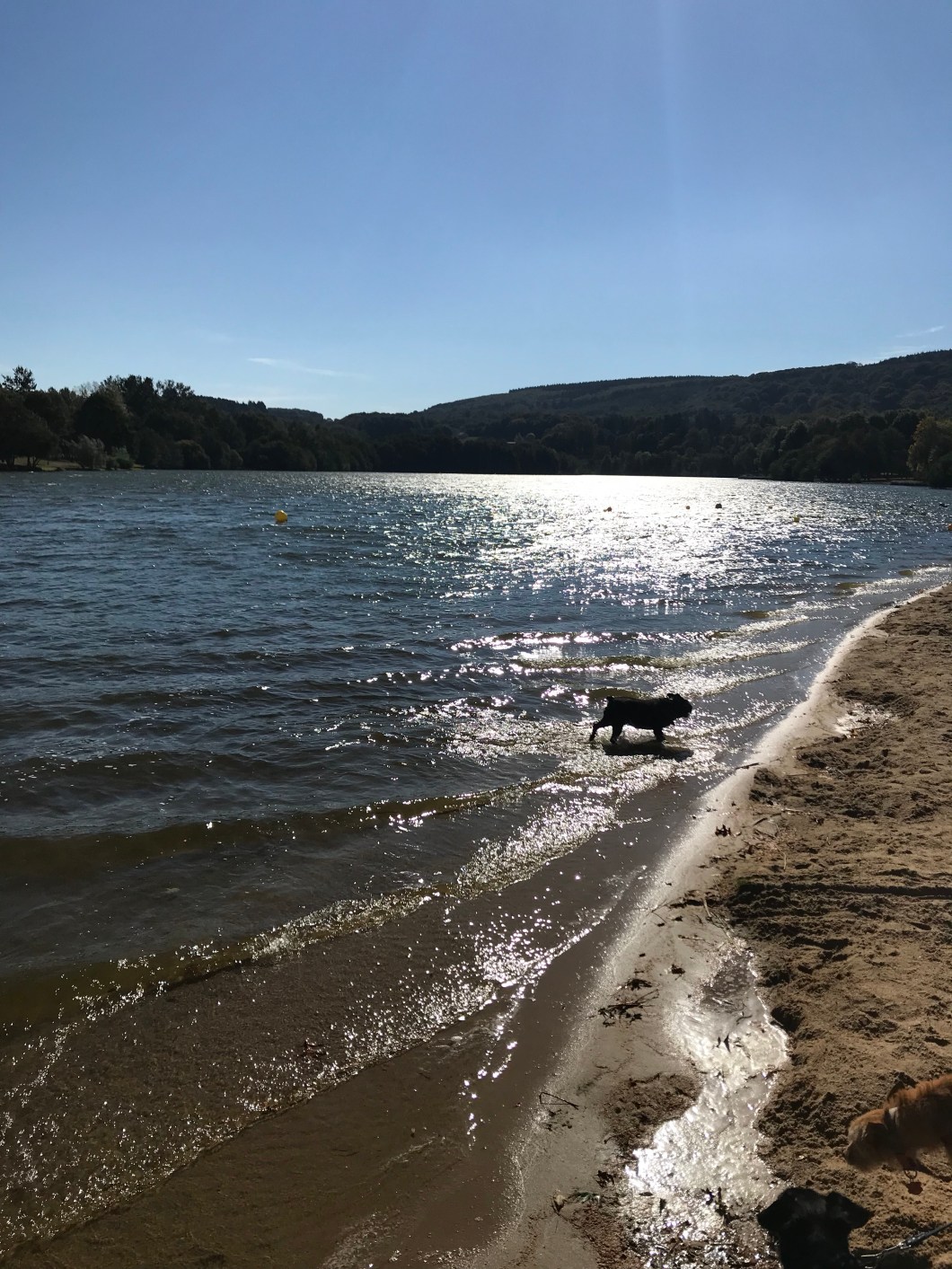 Finally, we had a lovely dog walk and picnic at Guéret this weekend. It was really hot, but windy, and at 1.00pm on a Sunday, we had the place pretty much to ourselves. After 2.00pm a few more people trickled out but only about a tenth of the people that were parked in the car park of the Royal Wok, the most excellent Chinese buffet restaurant we’ve been to a few times now. Perhaps that’s where they all were. It’s fab to have places like that to yourself. Shelly got to go for paddles off the sandy beach and he was absolutely thrilled!