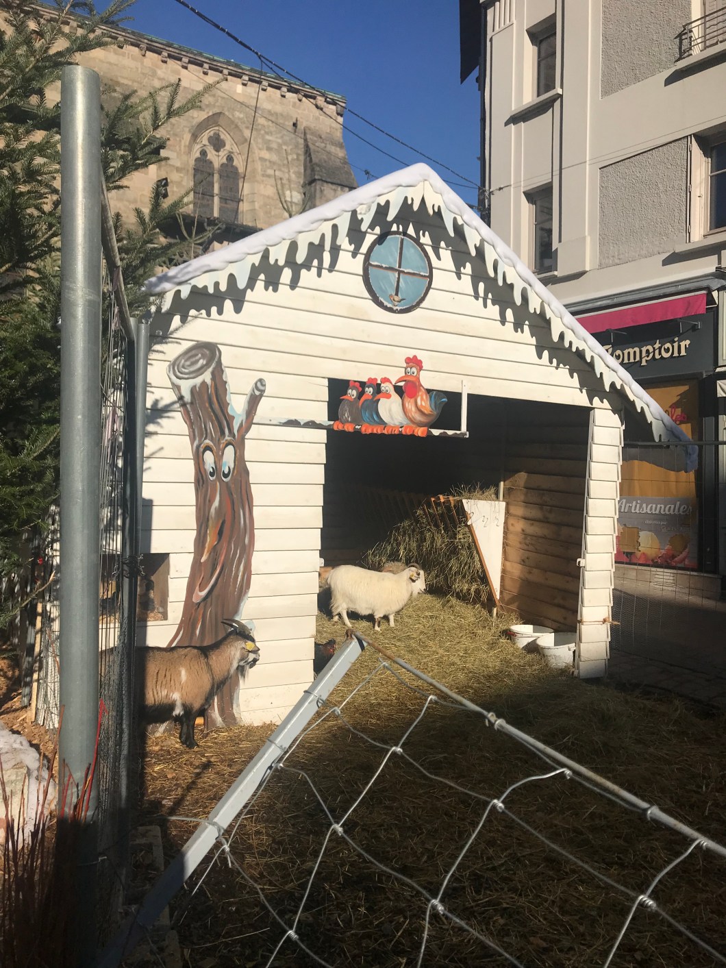 Pere Noel has a little wooden farmstead, complete with live goats, roosters and baby chicks.