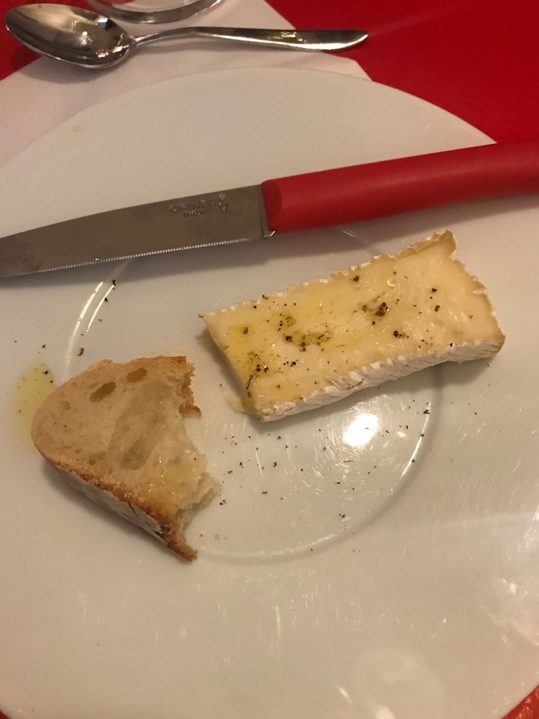 Then we were asked if we’d like a little cheese. We answered oui in immediate unison. A generous slab of a really good Brie appeared, drizzled with olive oil and topped with a whisper of grated black truffle. Oh my good lord! Flipping amazing.