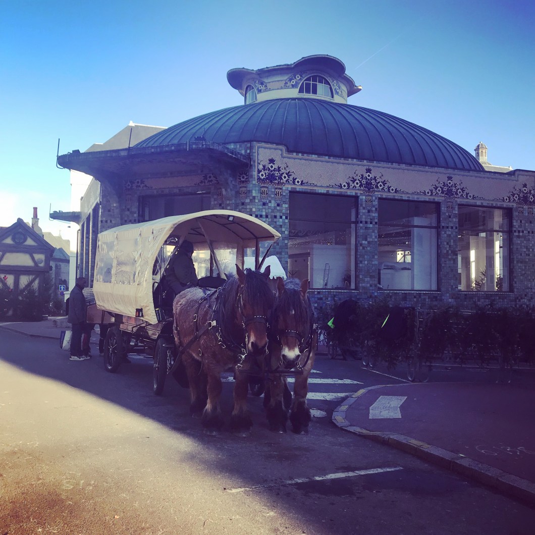 Two shaggy, adorable heavy horses are pulling a carriage full of people on joy-rides through the cobbled streets.