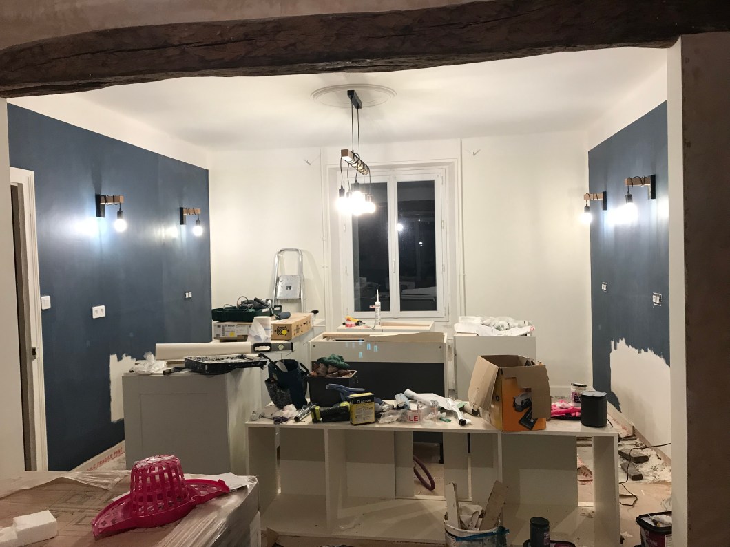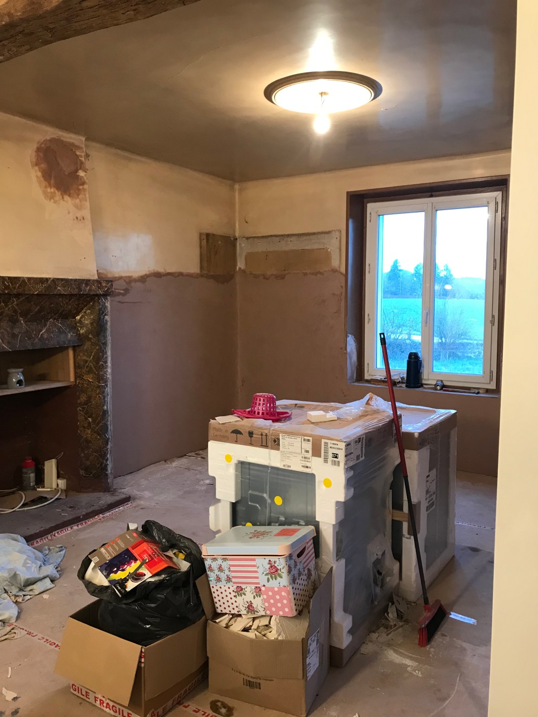 Hanging the lining paper was slightly problematic, we did the first two strips by pasting the wall rather than the paper – epic fail! More bubbles than an Aero. We then switched to a makeshift pasting table, a vintage wooden stepladder, dining room chair, braced with a box of flat pack kitchen something or other affair. Left the paper for 10 minutes once pasted and then it went up like a dream! Started to paint the walls the following day and on those first two strips you could feel the roller pulling the paper away from the wall, but it still looked ok. By the time I’d finished the wall however, after hours of painstakingly cutting in the very dark blue, those first two strips looked absolutely horrendous. Had to peel them off and re hang, but got there in the end after a couple of longish days. Absolutely love the colour, and it’s amazing how much more finished a coat of paint makes a room feel. Le Papa yesterday added some more cement to where the old bedroom (now to be kitchen) fireplace hearth was, so there’s much less difference in level now. Our joiner/kitchen fitter will then begin battle on the 25th with levelling everything and installing the worktops. Can’t wait to see it all come together.