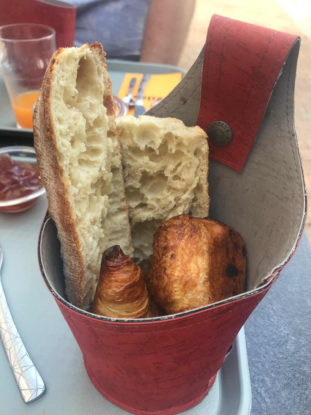 The setting is pleasant enough, and we opted for the €10 breakfast menu, plus a large bottle of Evian as we were desperately thirsty, the day was already hot. This by the way was over €5 for a litre bottle, so beware. 20 minutes in, we still hadn’t received anything, the only thing we really cared about was the water, but no sign of that either. Then a panier of warm pastries arrived, a croissant, mini pain au raisin, and a small piece of baguette cut in to two. Butter and a dish of jam, a dayglo half glass of juice that didn’t look like it had seen a piece of fruit, and a small coffee. This was placed down on the table and the waiter turned tail. No water still, they had forgotten.