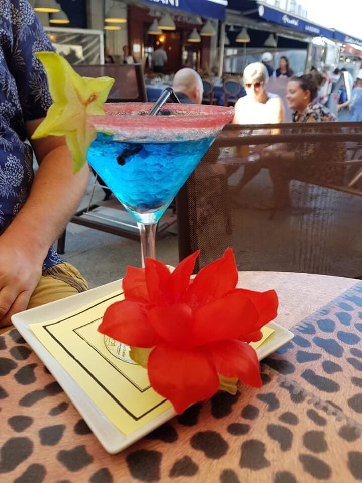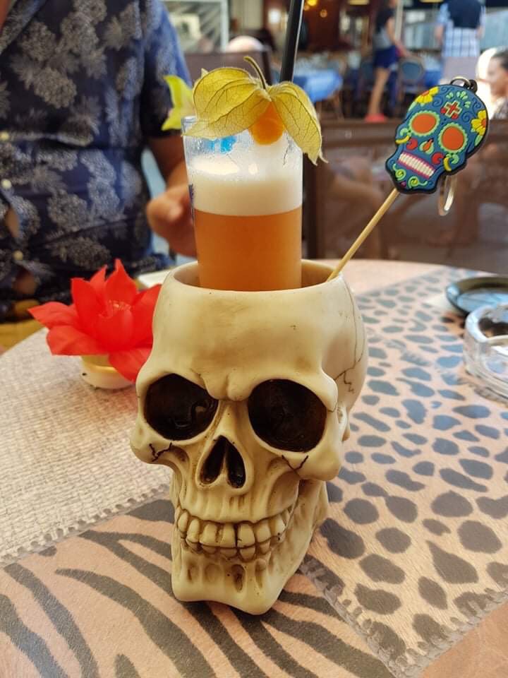 Via Brazil, was great fun, but Jesus, those cocktails would anaesthetise a horse! Mine arrived in a skull, with a key ring you could keep. Hub’s was bright blue, and a proper Del-boy drink, complete with flashing fibre-optic orchid, that did end up clipped to his beard at one point…… we only had one. I think we would have needed paramedics if we’d had 2.
