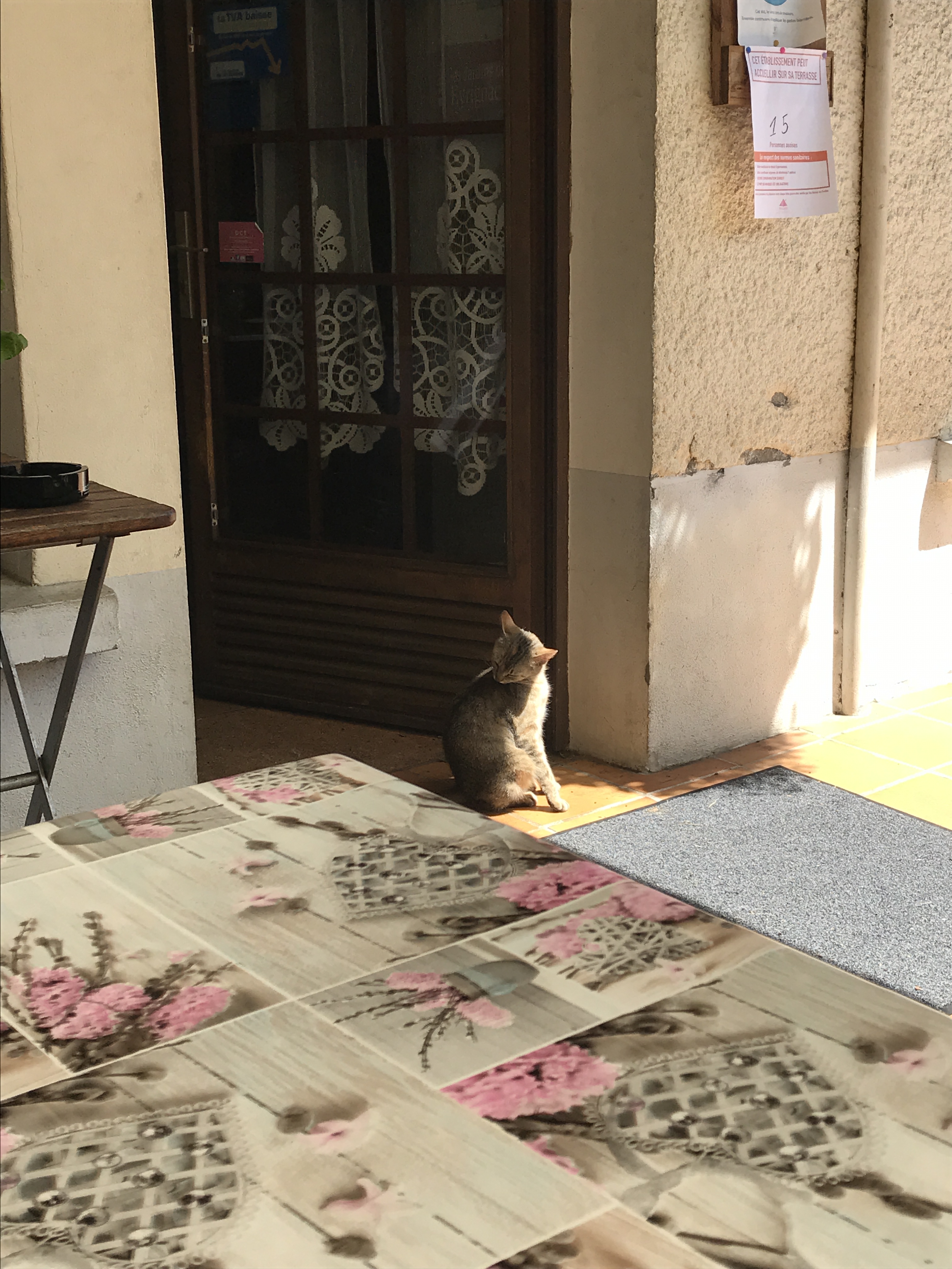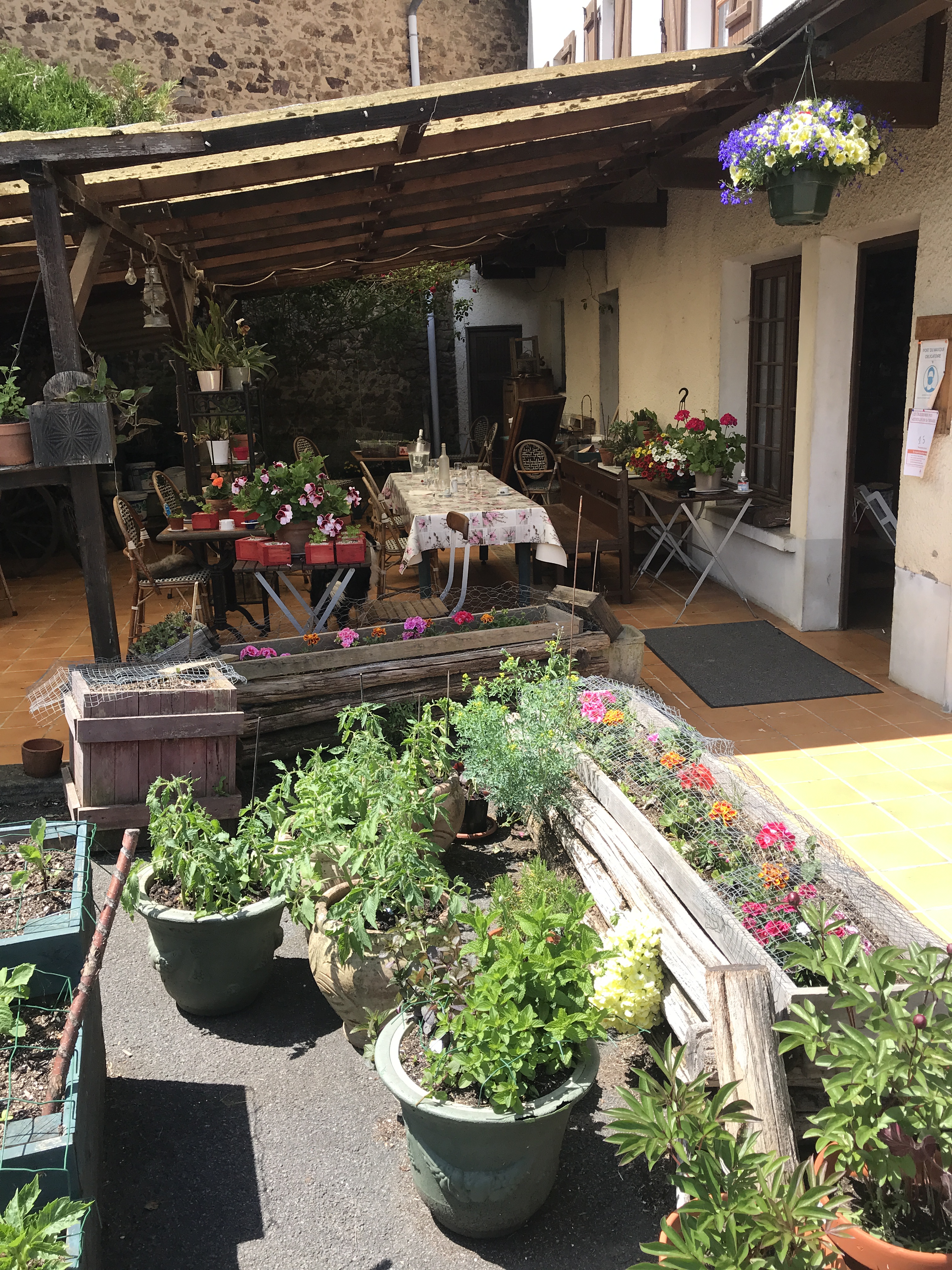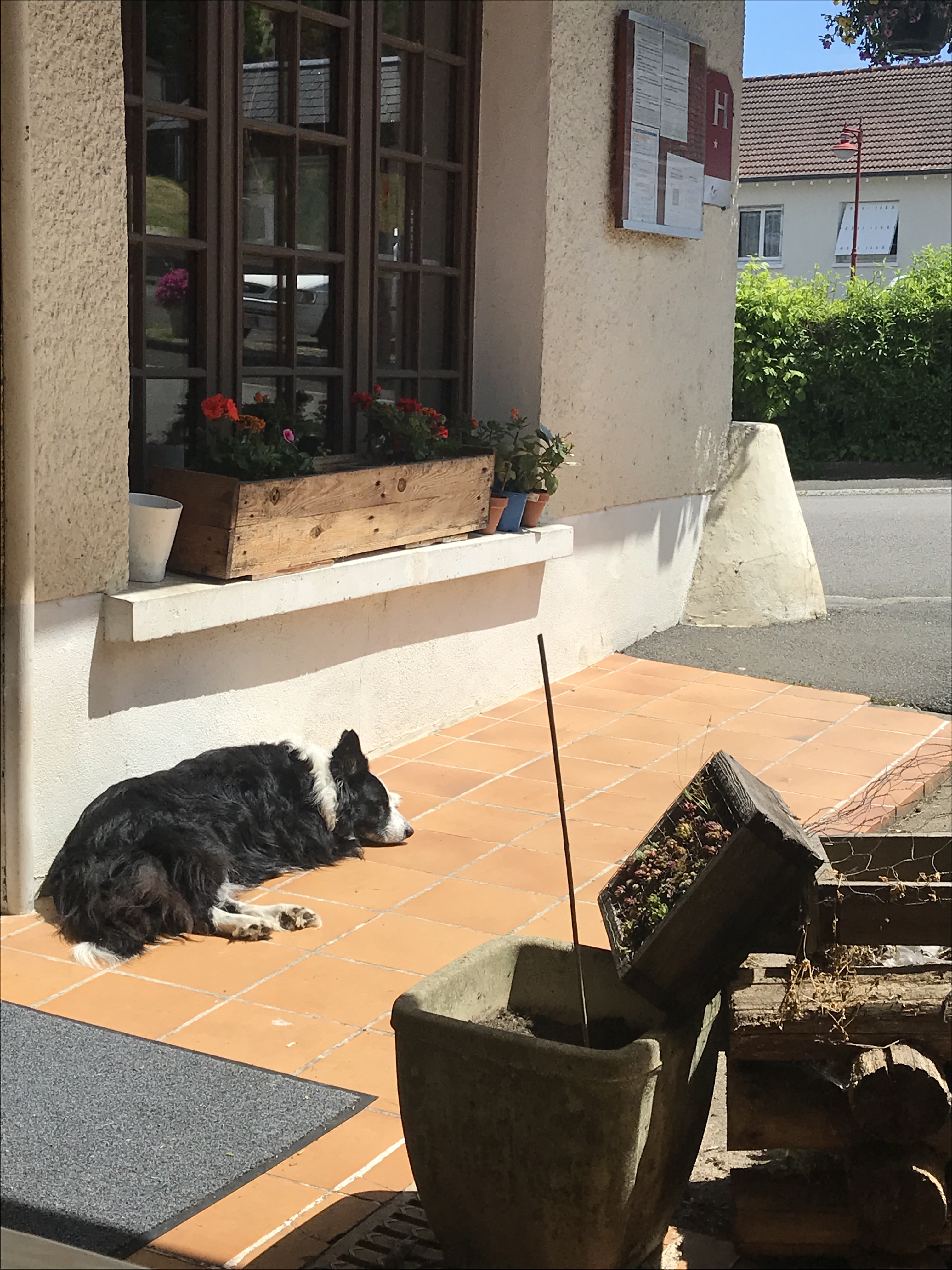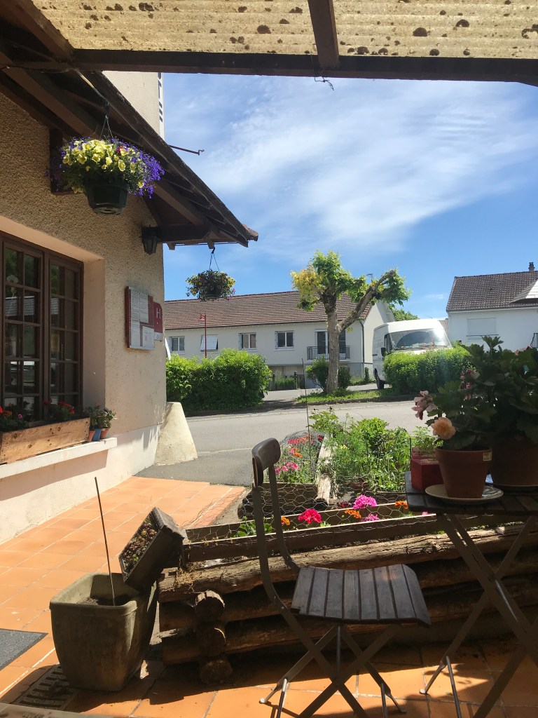 Today was a very good day, for today we went out for lunch for the first time in almost a year. We had settled on a little Auberge in the village we went to watch the Tour de France last year. In September it had a variety of animals ambling about, and planters had pumpkins and squashes spilling out into the street. Was so pretty. We booked a table yesterday and it didn’t disappoint. Firstly we were the only ones there, so we had the full covered terrace to ourselves, just the 4 of us. The lovely lady came out and told us the plat du jour menu which I caught about 3/4 of and as usual for these parts, it was quite pork heavy. I had to be that difficult guy asking if there was a vegetarian option. I have low expectations when I do this. See “hot melon gate” and “white rice, chips and a solitary broccoli floret gate” for details of vegetarian options past. The owner was lovely, spoke great English and offered to cook me some fish instead which is fine with me. So first course for everyone else was melon and Serrano ham, I had melon and radishes with a big basket of good bread for the table. All good. Main course was pork steaks with an oniony sauce for the rest of the table, and I had a gorgeous piece of lightly battered fried fish, we all had the same fried potatoes. Luckily I spied the big chunks of bacon in the potatoes and just popped them to one side. I’m not an evangelical veggie (I do eat chicken, born of a need for some lean protein), I loved eating meat once upon a time, just my conscience precludes me eating it now – my issue, no-one else’s, so the potatoes themselves were devoured and hubs had the bacony goodness I picked out. Next course was cheese, served the French way, so basically on a plate with a knife and fork, but we squirrelled away the bread basket which has a habit of being stolen away after the starter – why?! A lovely slice each of Brie and a Tomme. Then pudding which was a cherry and orange blossom clafoutis, I think with some ground almonds in it, and most importantly the stones still in the cherries. I enjoyed it but was a little floral for me, it reminded me of my shower gel a bit. Then coffees all round, and we’d had a bottle of rose wine and 2 panaches. Guess how much? €78 for 4. Amazing. Loved the place with it’s hanging baskets, roaming cats and lovely old border collie laid in the sun. We’ll definitely be back. Always great to find another favourite spot.