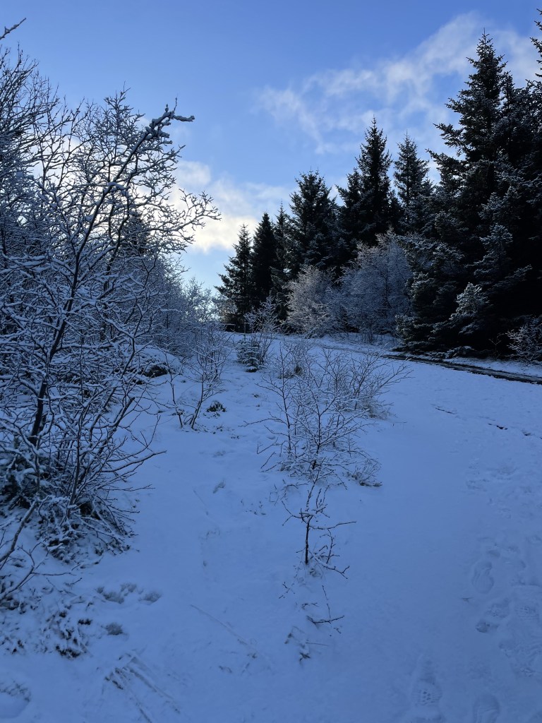 Then we started to walk to the Perlan, Iceland’s national museum, about 25 minutes away, through the fresh snow, and up a pretty steep woodland path which looked like Narnia this morning. Every vlog I’d watched before coming here said bring crampons. Nowhere was it mentioned that the main paths are actually heated. All that geothermic energy put to very good use, so 80% of our walk was on a totally snow free surface.