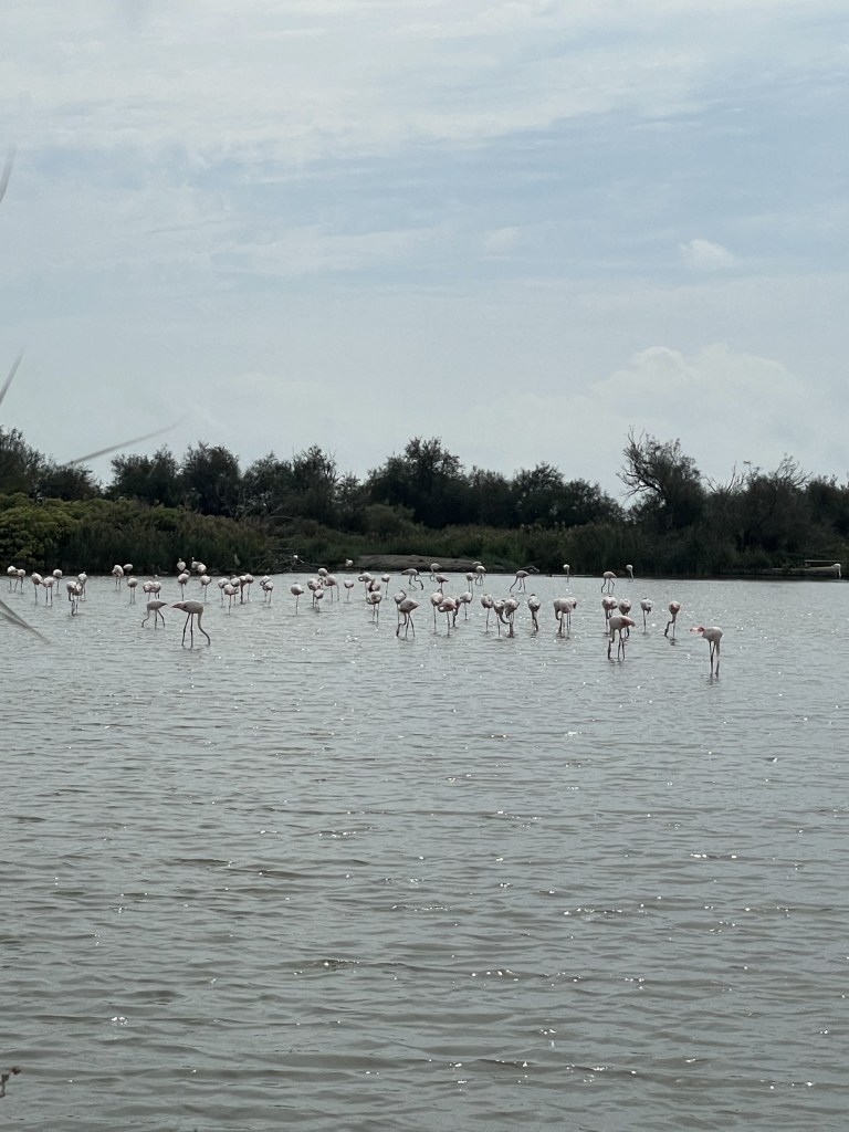 Before we came to check in we went to see the flamingos at the Parc Ornathologique a few KM away, and they were delightful. So many of them and the little noises they make! They sound like little pigs grunting, like the pig squeaky toy we bought for our late dog Cleo that she chewed the arse and the snout off within 15 minutes. But when they’re feeding they make a noise like a snorkelling pig. Think grunting but with bubbles. Absolutely delightful. Plus when they fly, they are like little flying sticks. Love them, and they are the least threatening creatures I’ve ever had the pleasure of encountering. I don’t think wars would be waged if people sat for half an hour and listened to flamingos. Someone send some to Putin please.