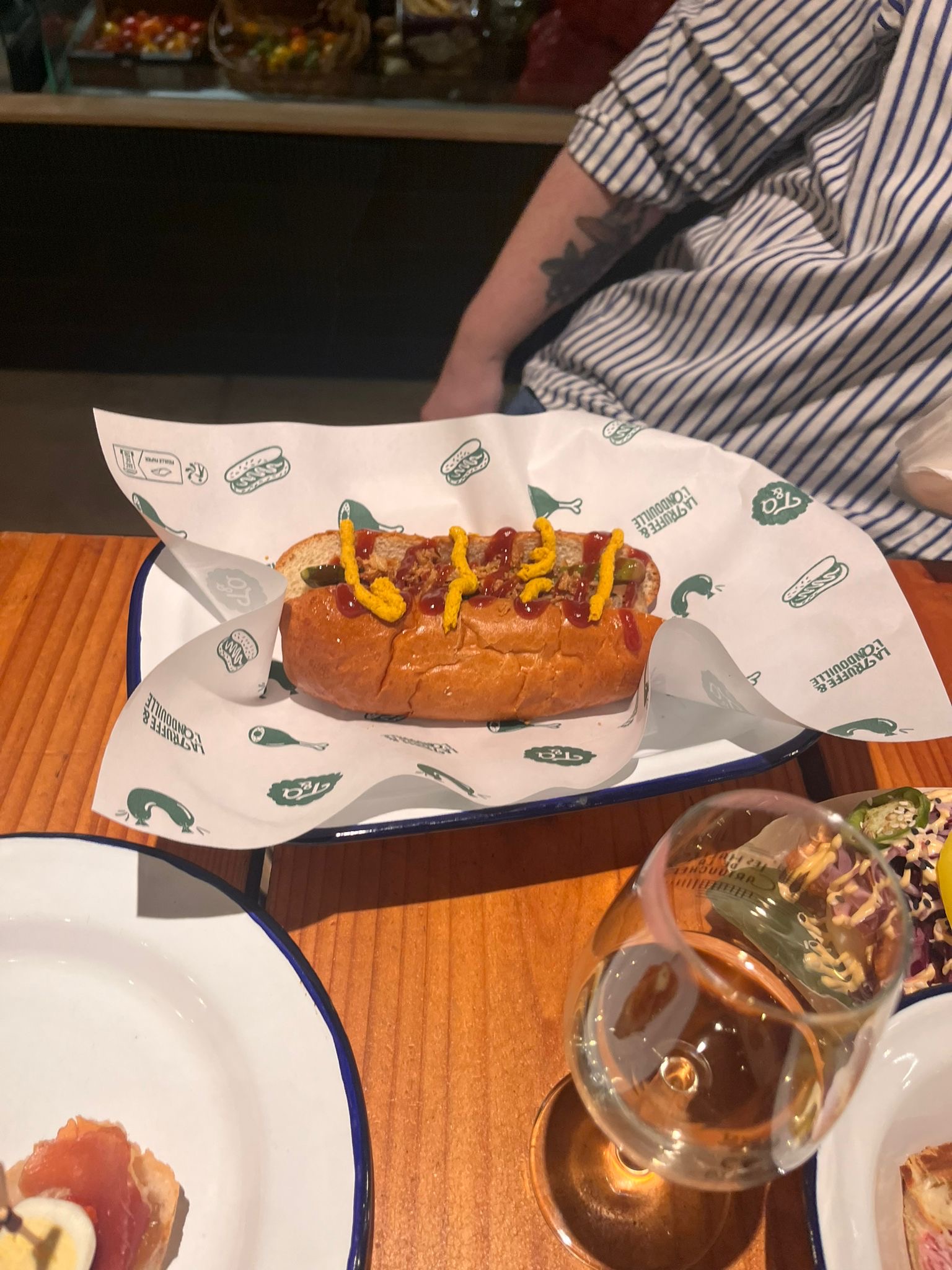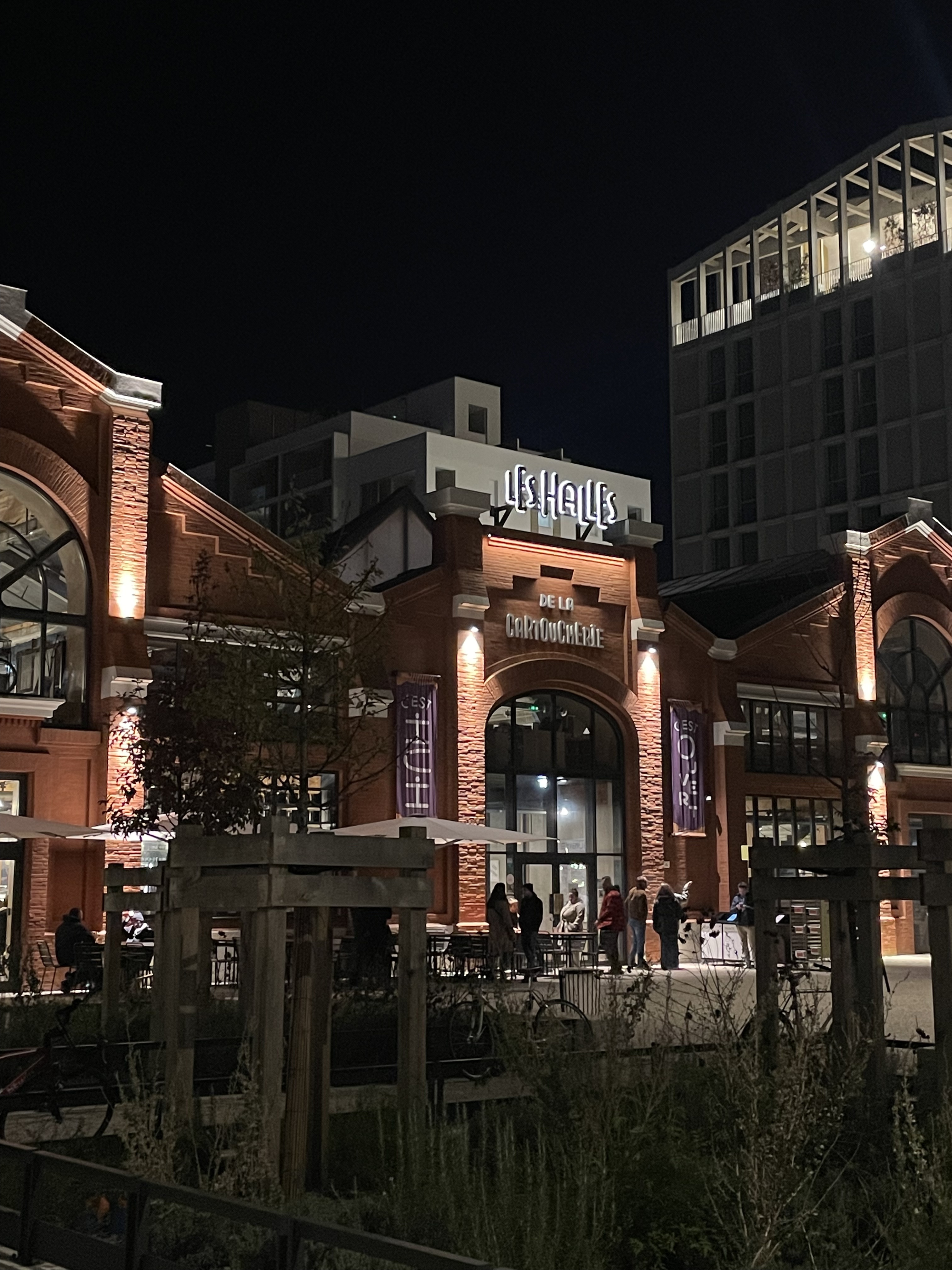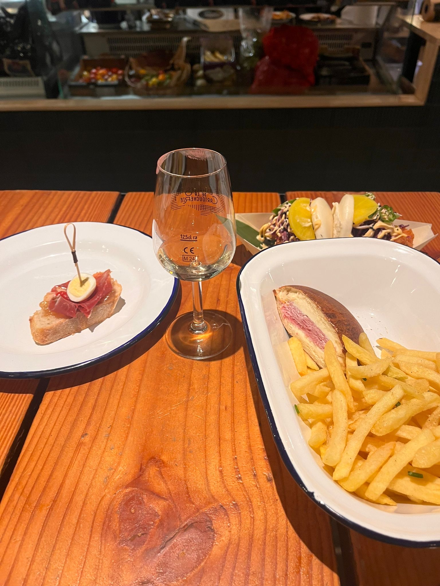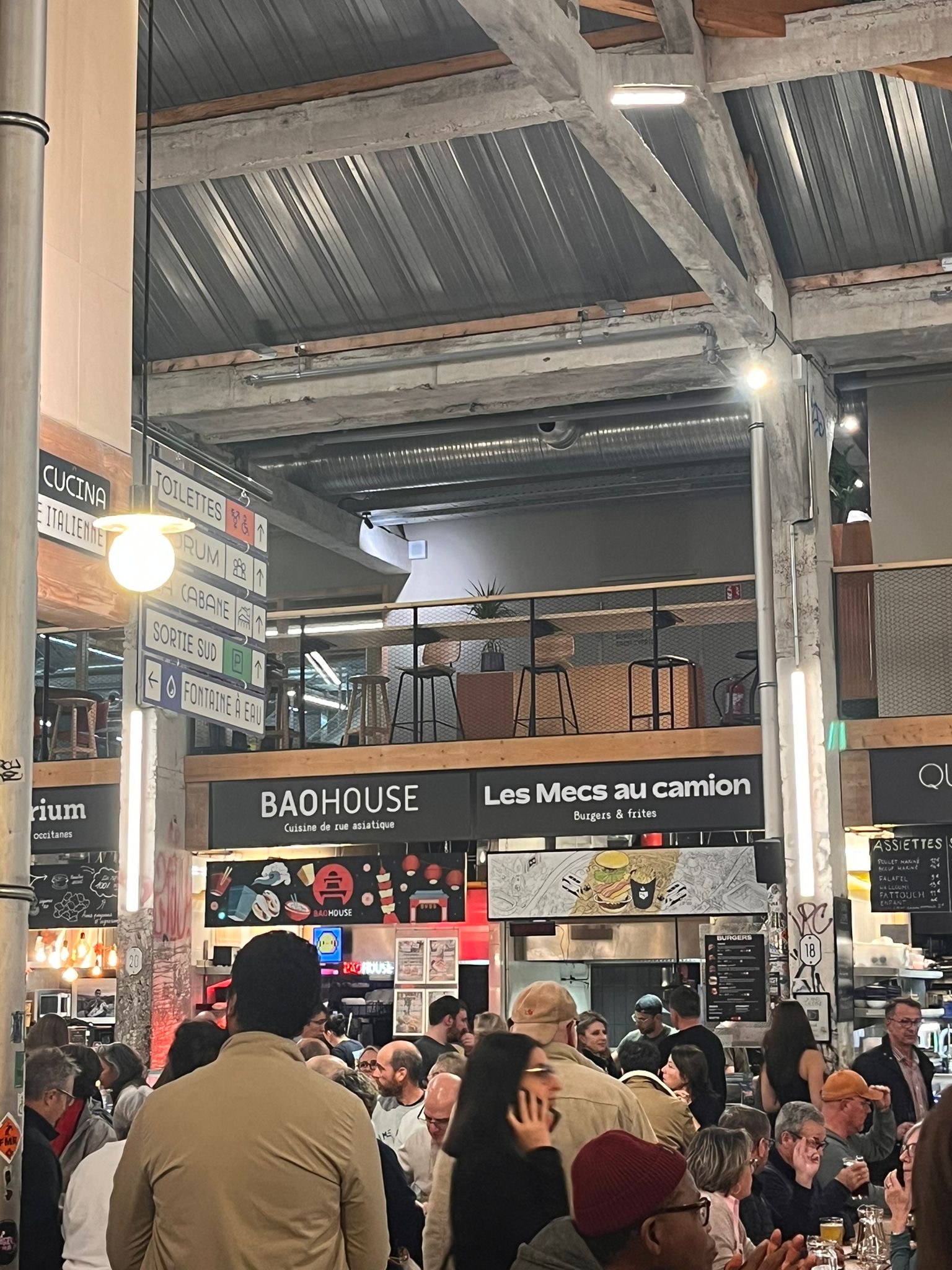Dinner was at Les Halles De la Cartoucherie, a big industrial warehousing building that housed co-working spaces, a library, shops, a climbing wall and (unsurprisingly), the reason for our visit, multiple food vendors around a central communal eating space, so we could choose from a huge amount of options from West African to Lebanese, to traditional French, Thai, Bao Buns, hotdogs, seafood – all sorts. The premise is that you scan a QR code on the table, order your food from any of the vendors you choose. You then get a text message when the food is ready, and you collect it from the relevant vendor. The orders were ready super quickly, so I was dashing off collecting Pinxtos of Iberian ham and anchovies with quail eggs, a New York hot dog made with Toulouse sausage (what else), topped with pickles and mustard, Katsu style chicken bao buns, and hubs had a sort of brioche croque monsieur. You could order drinks the same way, or like everything else, you could also go direct to the stall to order, everything from Breton cider, to wine caves, to a really good Old Fashioned, my drink of choice. Was a lively place with a great atmosphere, full of people of all ages which I thought was really nice.