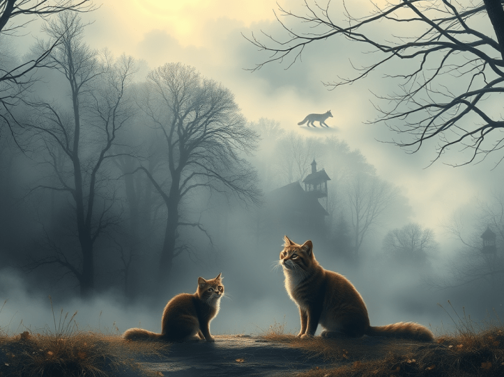 “Create a high-resolution, highly detailed image for a blog post titled “The Witching Season: Music, Cats, and Autumn Magic.” The main subject features an ethereal autumn landscape with layers of trees in varying shades of grey, shrouded in morning mist, reminiscent of a theatre set. Include two playful cats in the foreground, embodying a whimsical essence, and subtly include a distant family of foxes to add a sense of intrigue. The light should be soft and magical, evoking a cozy autumn morning. The image should be in sharp focus to highlight the enchanting details of the scene, capturing the essence of the witchy autumn vibes and love for cats”.