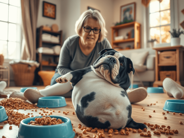 “Create a highly detailed, high-resolution image depicting a humorous scene of a clumsy pet owner interacting with a playful bulldog in a cozy, slightly chaotic home environment. The setting should show the owner, a middle-aged woman, looking sheepish and surrounded by scattered dog kibble and overturned water bowls. The bulldog, a black and white breed, should be on its back in a “ladybird” position, looking adorable and carefree. Capture warm morning light streaming through a window, casting soft shadows and highlighting the lighthearted chaos. Ensure sharp focus on both the woman and the bulldog, showcasing their expressions and the humorous details of the scene”.