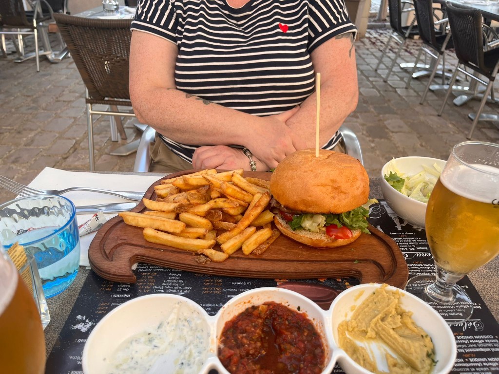 We ventured away from the confines of the hotels buffet dinners last night, and Craig found a little restaurant in the square of the charmingly bustling town of Saint-Aignan, called Hestia. We sat outside and fresh focaccia arrived with complimentary hummus, salsa and tzatziki. I had the burger, hubs had the mixed grill and both were delicious and way too big, I think I managed about 3 chips. We’d done 18k steps today and the humidity was making everything feel just a bit more difficult, so I think we were just finally glad to sit down and have a cold drink.