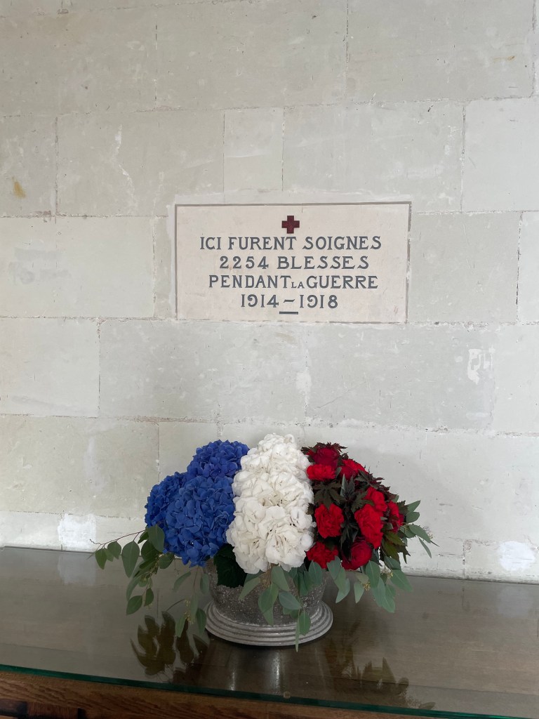 In WWI the great gallery and indeed the wider chateau, was used as a military hospital. Can you imagine returning from the horrors of life in the trenches to convalesce here? A plaque states that 2254 injured people were cared for here during this time. A simple red white and blue flower arrangement sits beneath in their honour.