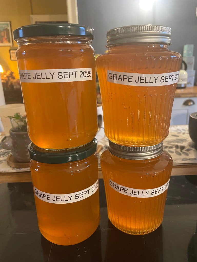 *evening update. I followed the instructions on the jam sugar in the end. It said for every kg of juice add a kg of the sugar. I had 1.3/4l and I thought a litre of water weighed a kg, so we went with that, how different could grape juice actually be. I lobbed it into my cauldron if you will, and boiled it to within an inch of its life for 5 minutes, skimmed off the manky top scum and did the wrinkle test on a cold saucer. Never mind wrinkle, this stuff could bounce. I think we’re there. 4 large jars made, and 3 little ramekins are in the fridge. I’ll add it to the cupboard with all the other jam we don’t eat. If we do ever have a nuclear incident and need to raid the stores, it’ll be the tooth decay that gets us before the radiation sickness.